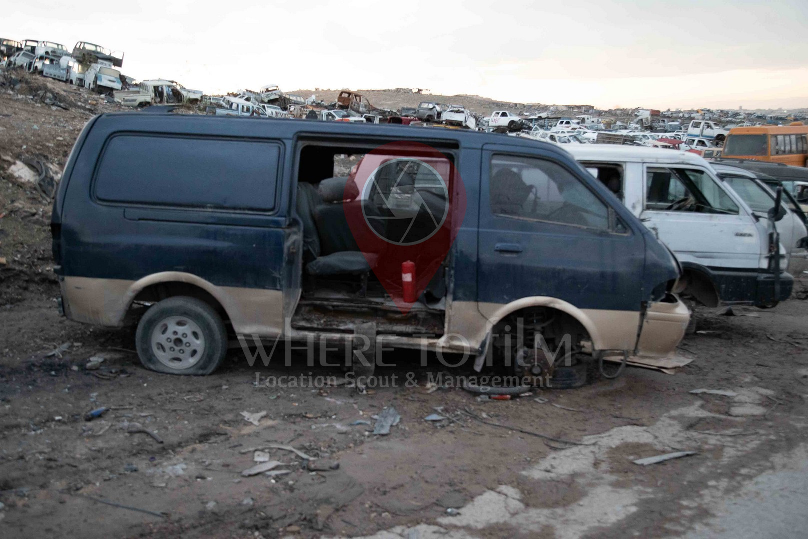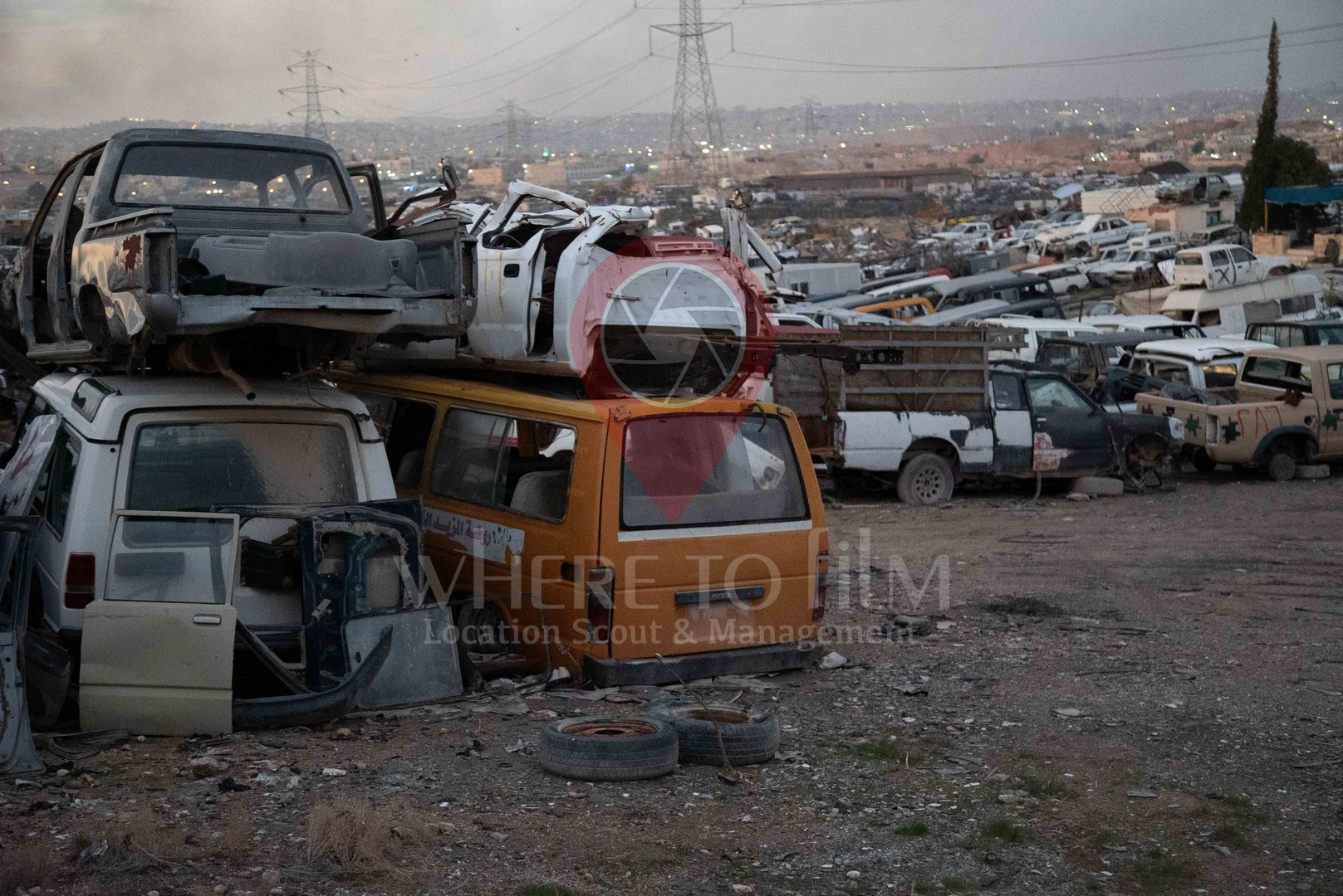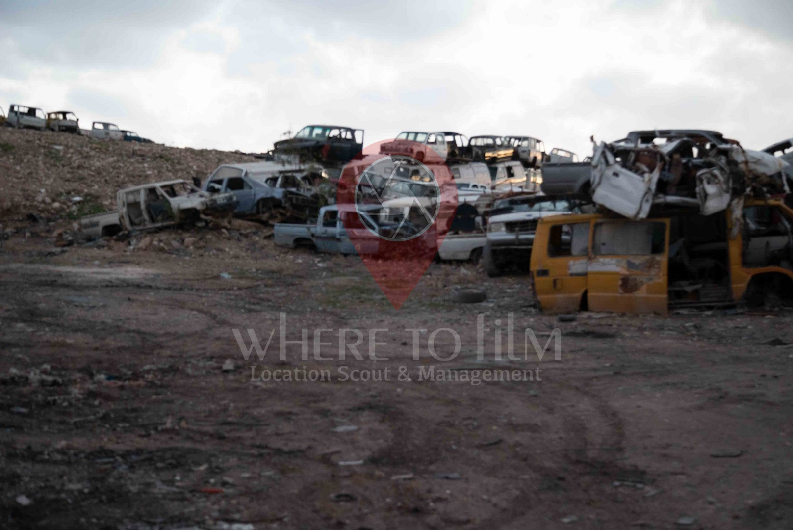 this scrap yard sits on a hillside with wide roads and many dismantled and decommissioned vehicles