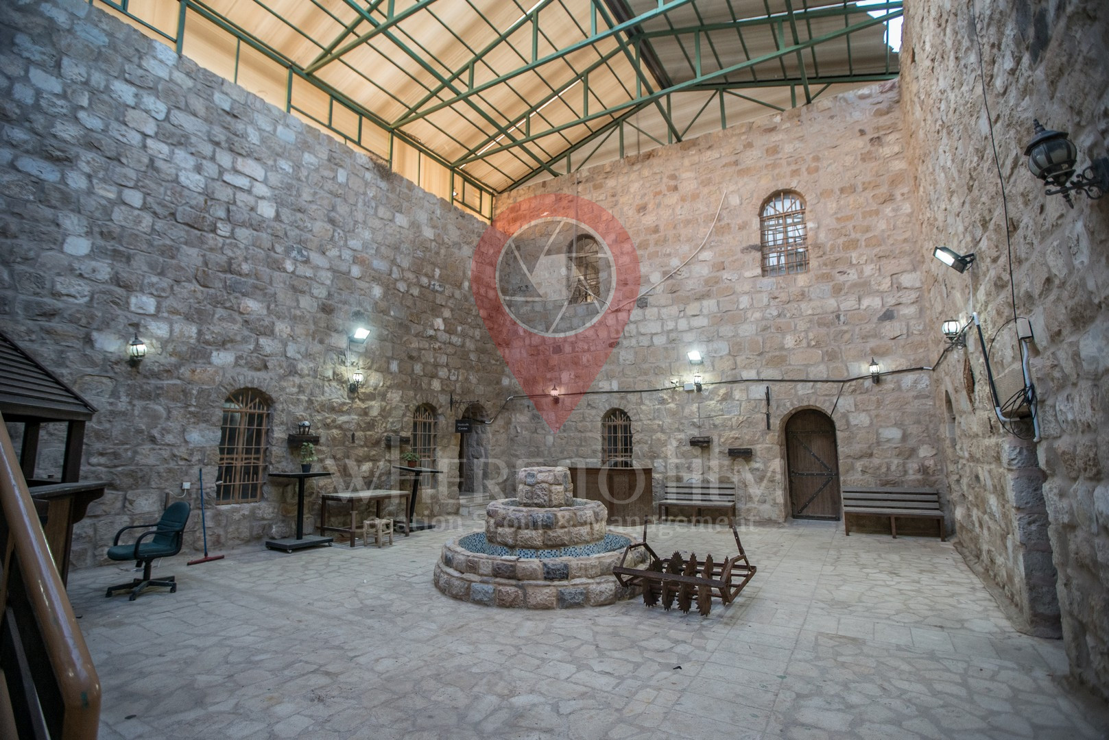Stone walls, large wooden tables, large outdoor area and a view on a large historic castle