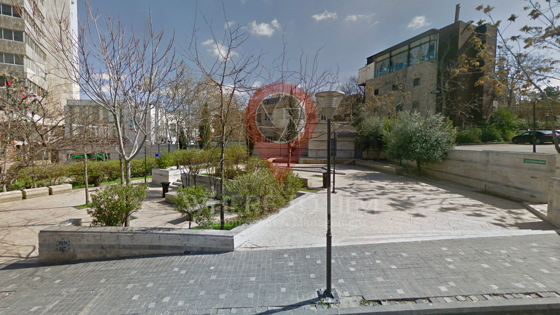 First Circle park is a cozy location with a couple of stone benches. The park is surrounded by a couple of buildings and trees.