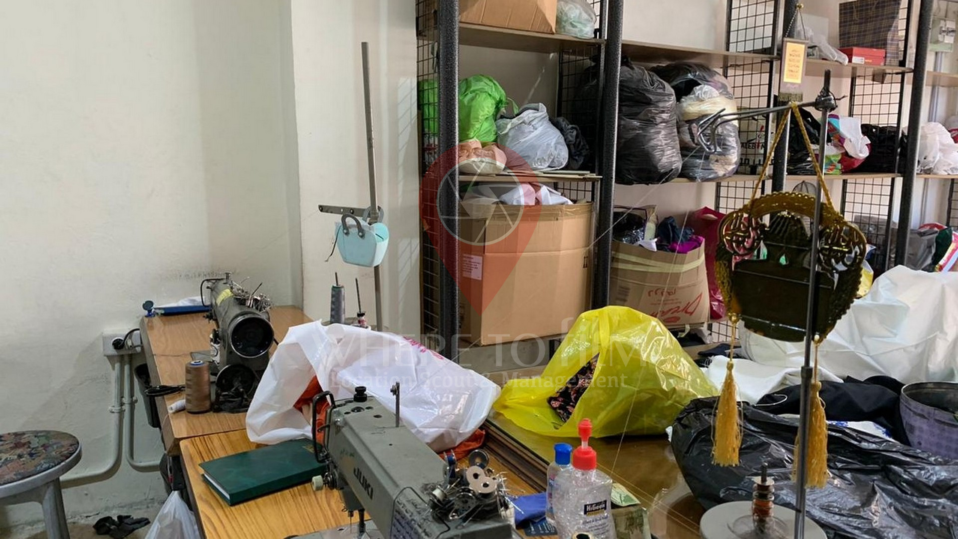 A medium sized chaotic sewing workshop with changing rooms and high ceiling.