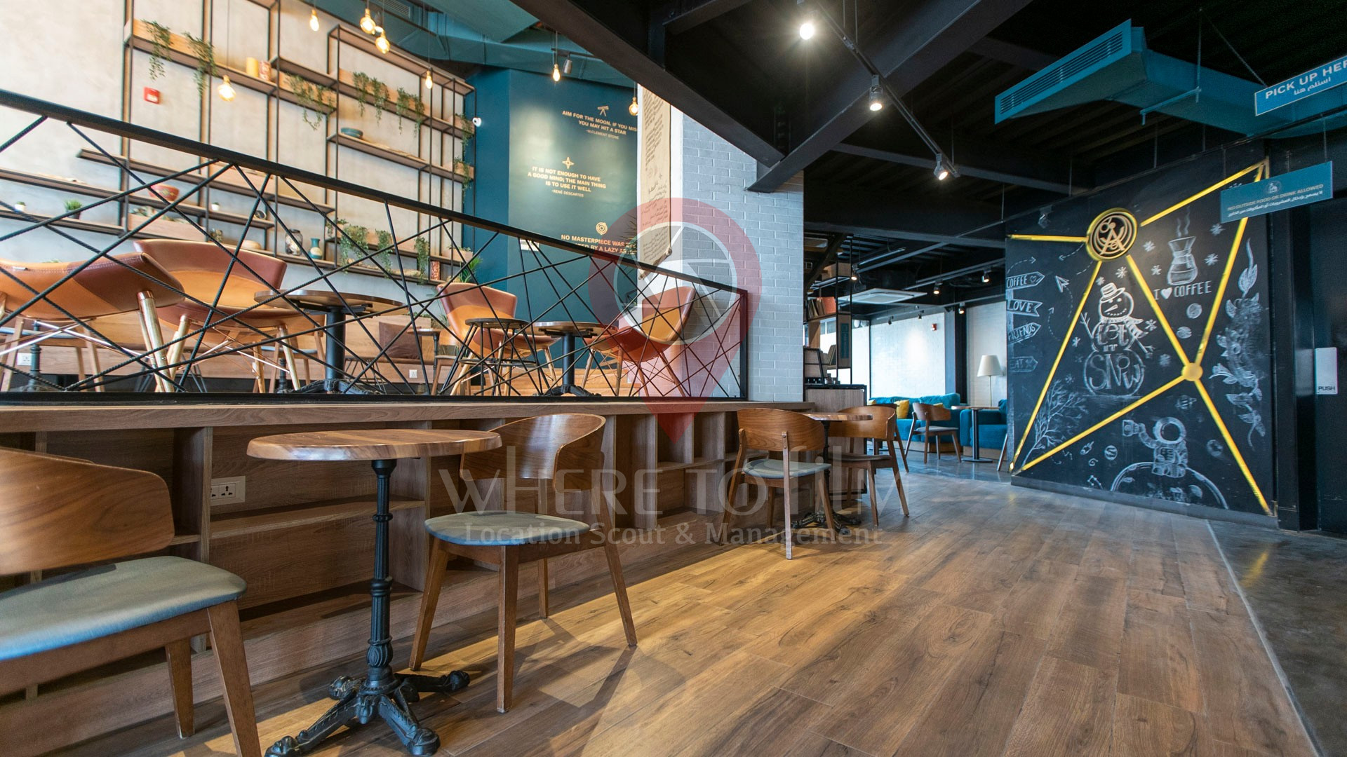 A large modern cafe/coffee house with a small library, a meeting room and an outdoor area.
