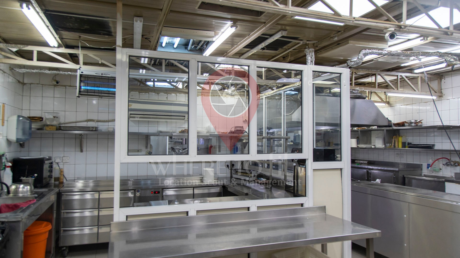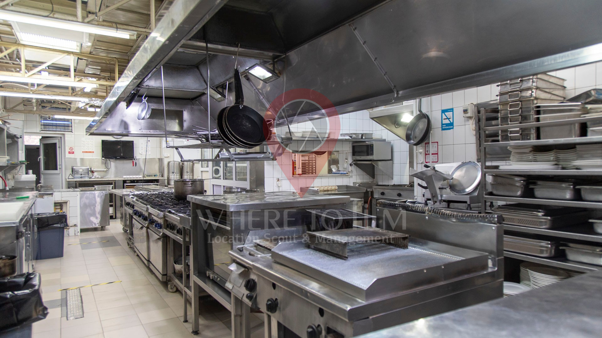 A restaurant's kitchen filled with kitchen equipment (stoves, refrigerators, ovens, etc.)