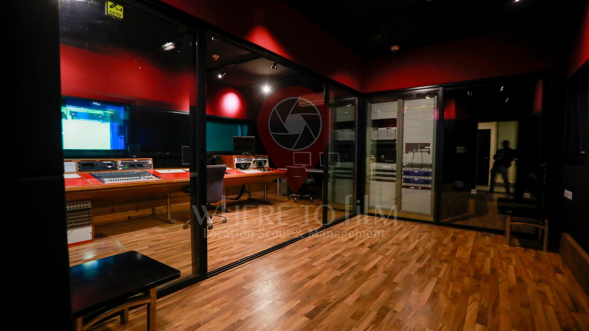 A control room with a vision mixer, audio equipment and access to a green screen and a blue screen studios