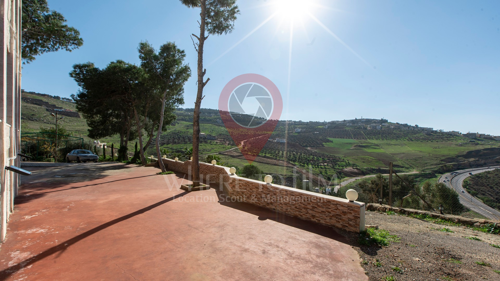 A farmhouse, with a mountain view, a Bedouin styled sitting area, a pool and a lot of greenery.